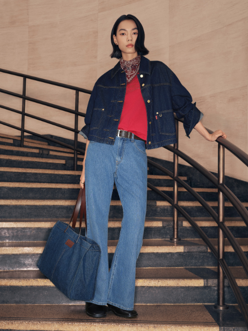 Phong cách denim-on-denim với phom ống loe rộng, xử lý layer tinh gọn,